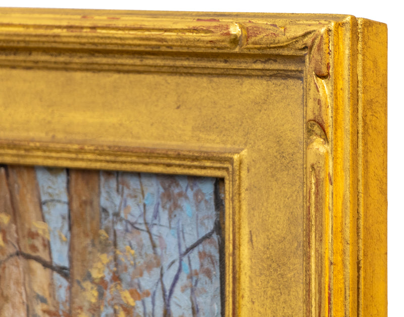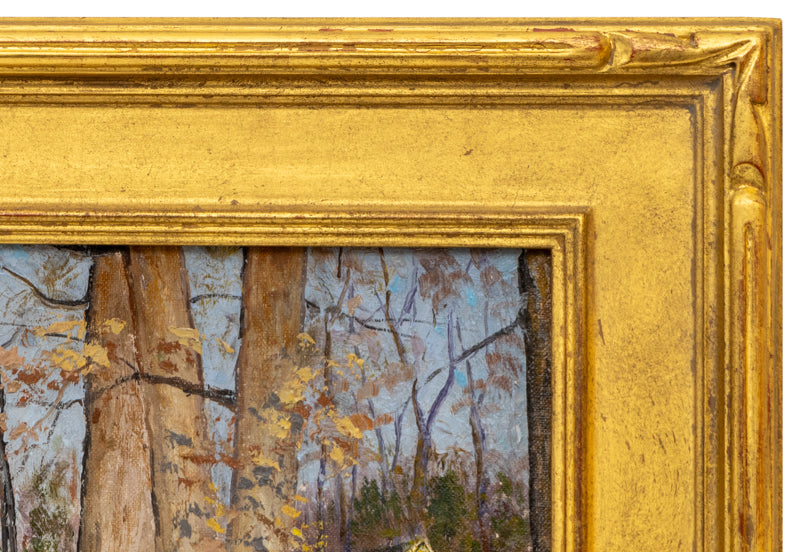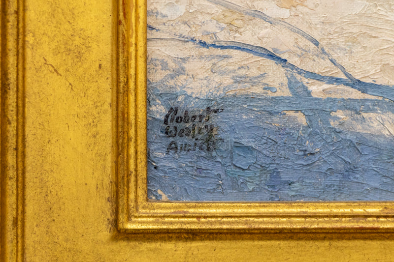 Original circa 1935 oil painting by Colorado artist Robert Wesley Amick. Composition depicts a quiet moment in a snowy town grove. Oil on board. Signed by the artist, lower left, and estate stamped on the reverse. Presented in a custom frame.