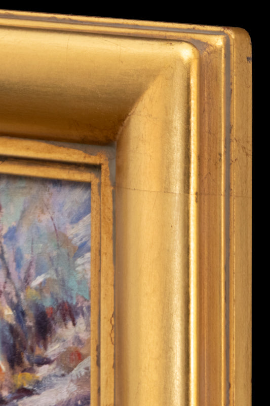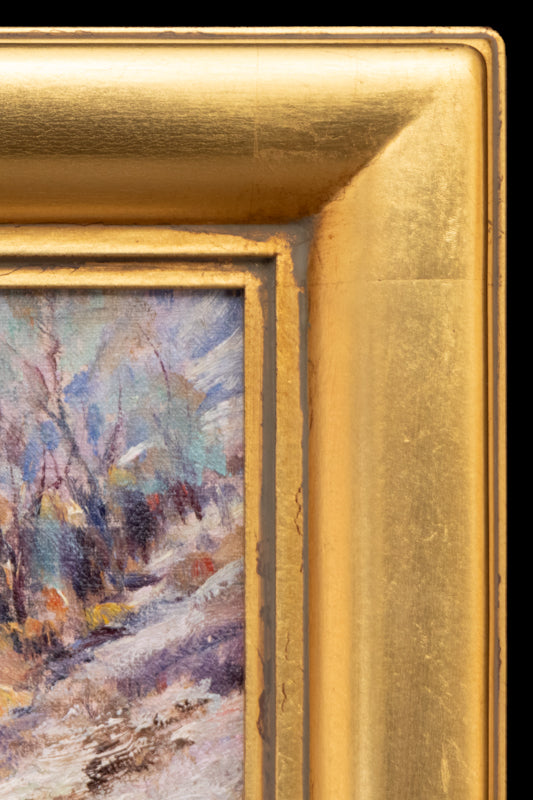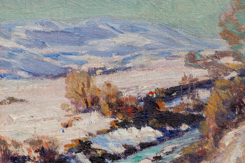 "Melting Snow," original vintage 1920s - 1930s painting of a Colorado winter landscape with a creek, bare trees, and mountains all blanketed in snow. Oil on board. Signed by the artist, lower right, and titled on reverse. Presented in a custom hand-carved gold leaf frame.