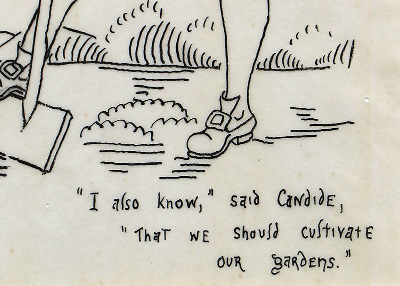 Original vintage circa 1928 drawing by artist Rockwell Kent. Illustration study for "Candide" by Voltaire. Caption within the image reads: "I also know," said Candide, "That we should cultivate our gardens". Drawn in india ink over graphite on vellum. Presented in a custom frame.