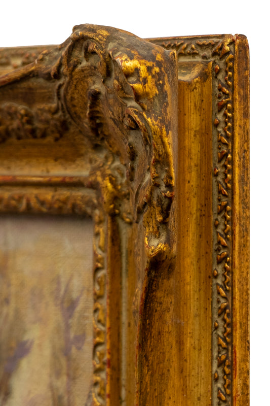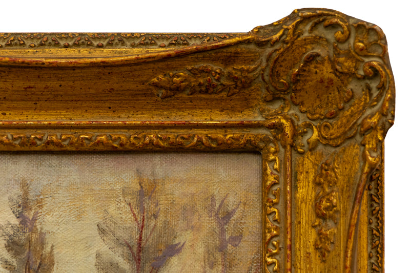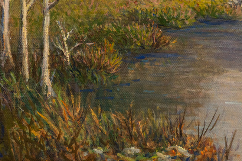 Original oil on canvas board painting by Rolla Sims Taylor (1872-1970) titled "Summer Idyll, Near San Antonio, Texas". Signed lower right. Idilic landscape scene of a house on a lake surrounded by trees. Presented in a custom frame measuring 24 ¼ x 20 ¼ inches; image size is 16 x 20 inches.