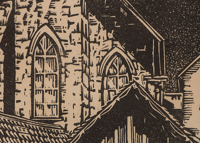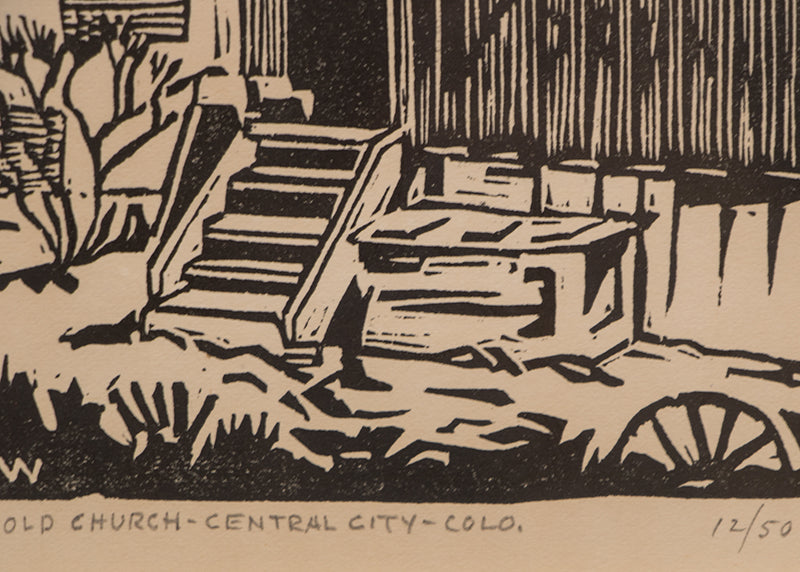 Original vintage woodblock print depicting St. James Church in Central City, Colorado. Signed by the artist and dated, 1934, lower right margin. Presented in a custom frame with an archival mat and AR Glass (UV Protection/Anti-reflective).