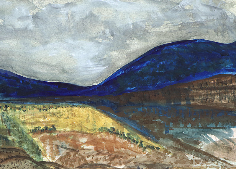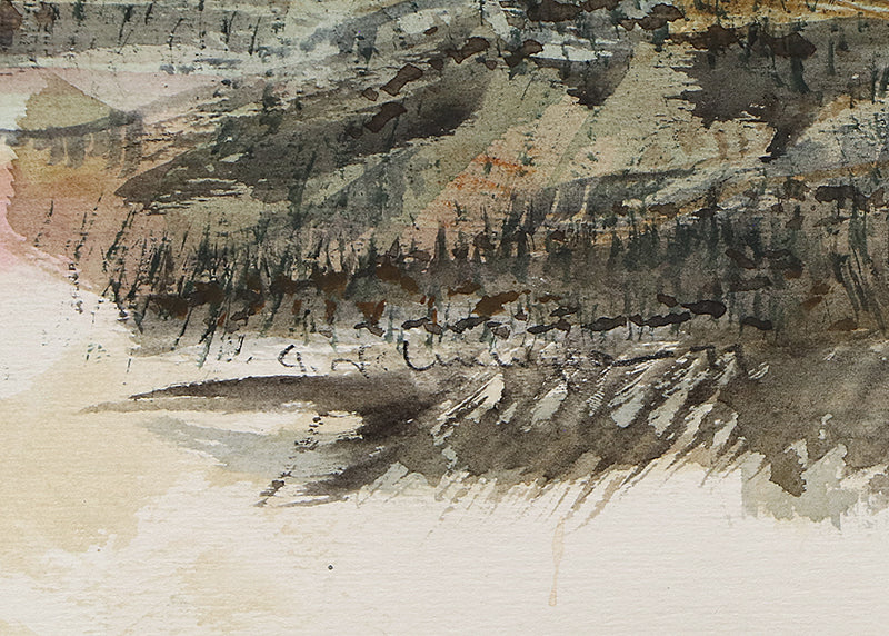 Taos Mountain, New Mexico, vintage 1970s Southwestern landscape painting. Watercolor on paper. Signed and dated, 1977, by the artist. Presented in a new custom frame with archival materials and UV70 protectant glass.