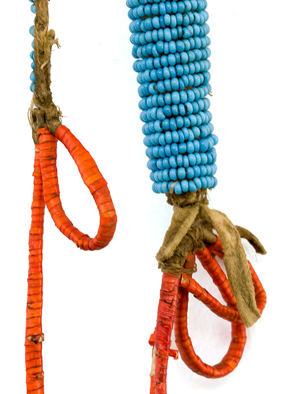 19th century Sioux awl case constructed of native tanned hide and wrapped in trade beads in a banded pattern of pony trader and dark blue, whiteheart red, white and greasy yellow. Quill-wrapped suspensions with tin-cone tinklers and horse hair,