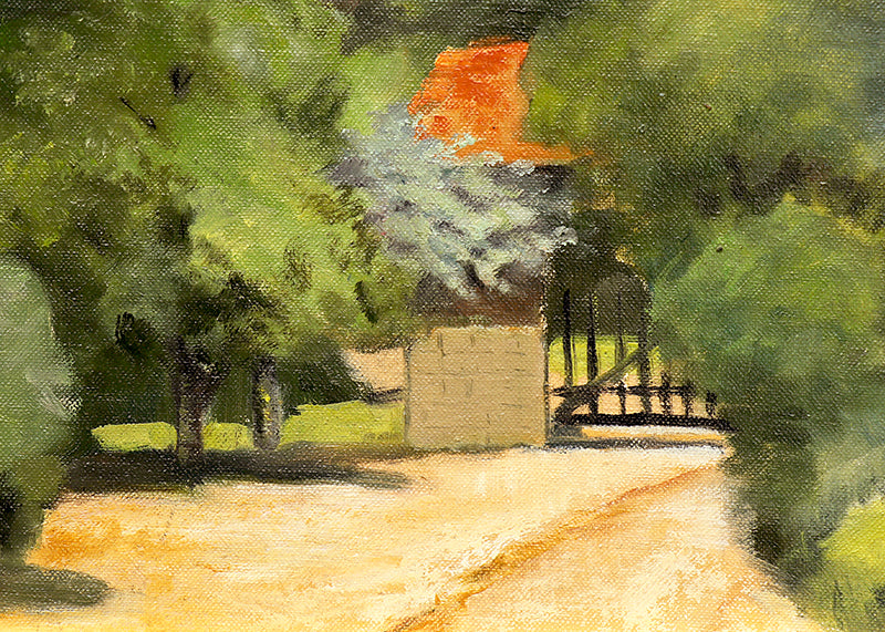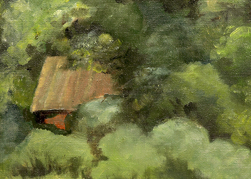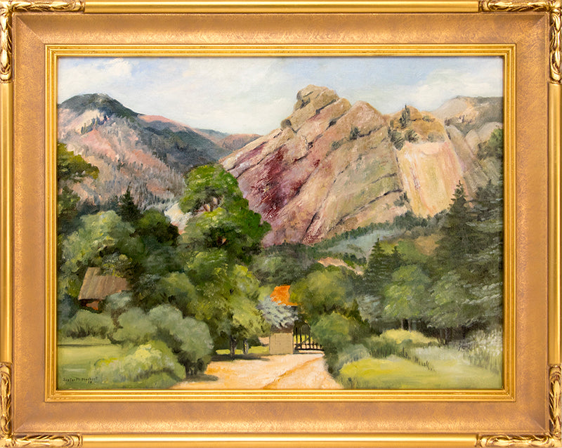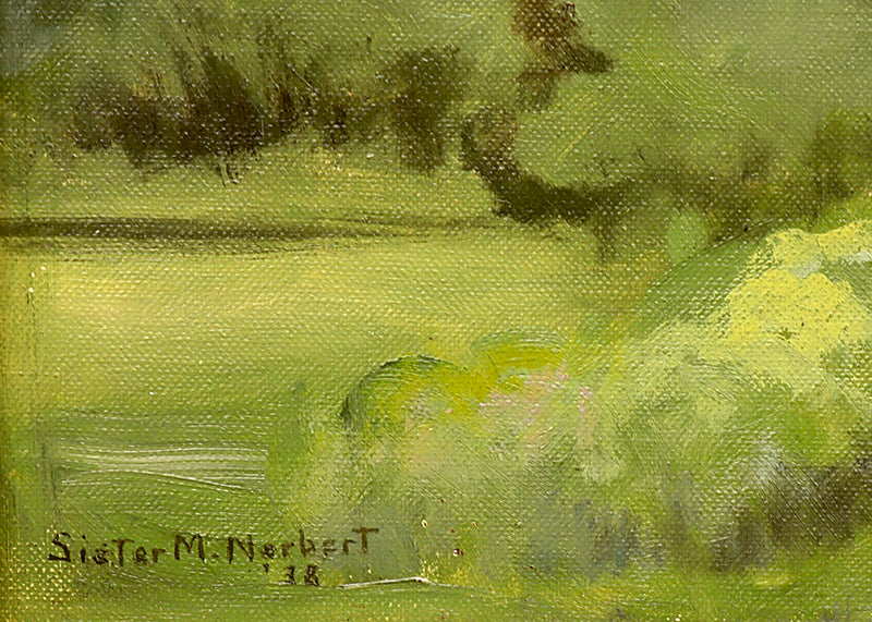 Untitled (Mountain Landscape in Summer), original painting by Sister Mary Norbert (1885-1979). Mountain landscape with lush trees and towering rock formations. Oil on board. Signed by the artist and dated, 1938, lower left. Presented in a custom frame.
