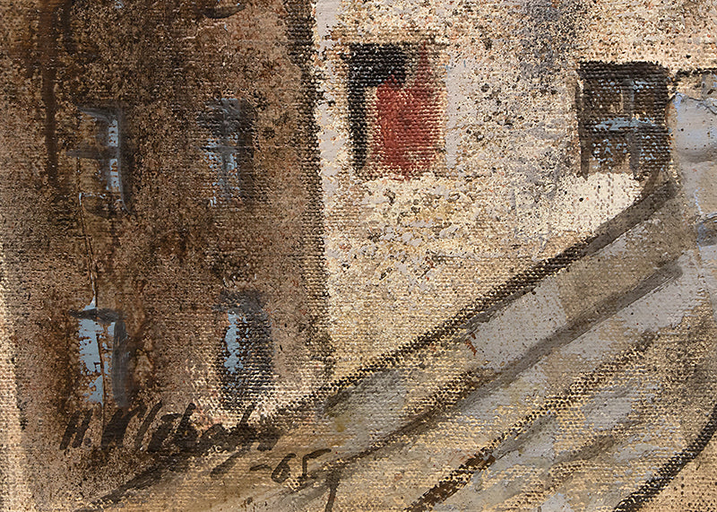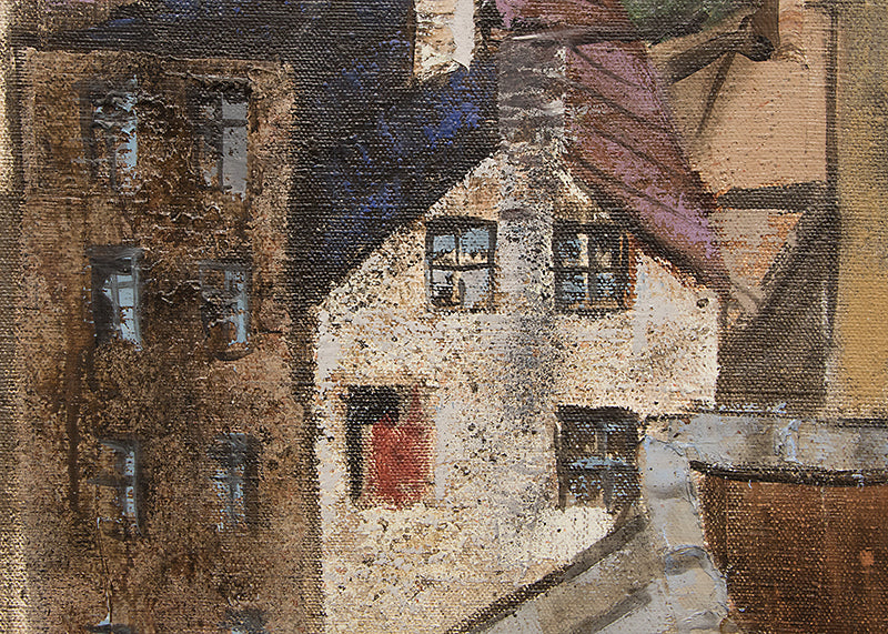 "Through the Window", original vintage mid 20th century painting by artist Tenree Kebax (Title and name translated from Russian). The composition depicts an aerial view of a city, potentially the town of Puza in Latvia. Oil on canvas. Signed by the artist and dated, 1965, lower left. Presented in a custom vintage frame.