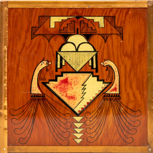 Square painted panel depicting two stylized birds, possibly thunderbirds. Rich in Diné (Navajo) and Plains imagery, this painting is one segment of a larger multi-panel artwork depicting multiple Native American pictographic stories. Presented in original copper wrap frame.