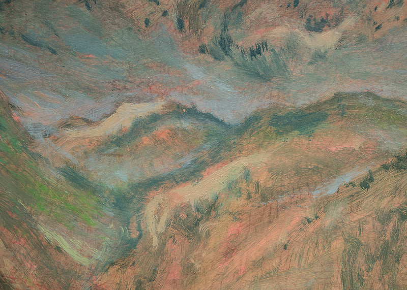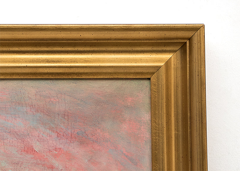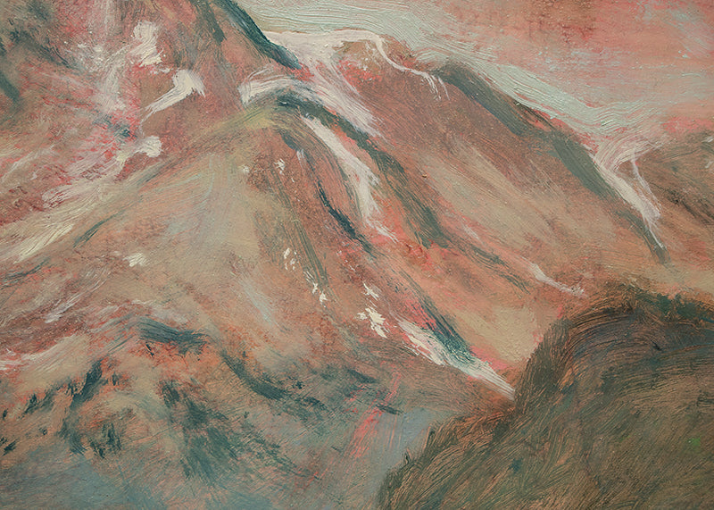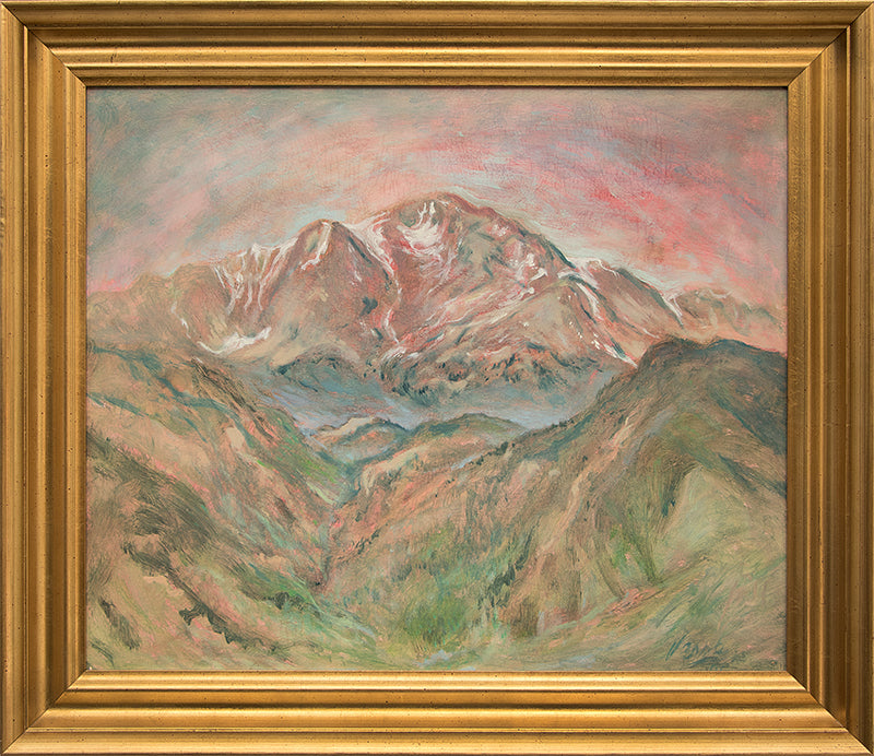 "Memorial Day, Pikes Peak", original vintage circa 1945 painting by artist Verna Jean Versa. Colorado mountain landscape featuring Pikes Peak under a soft pink sky. Oil on board. Signed by the artist, lower right. Presented in a custom frame.