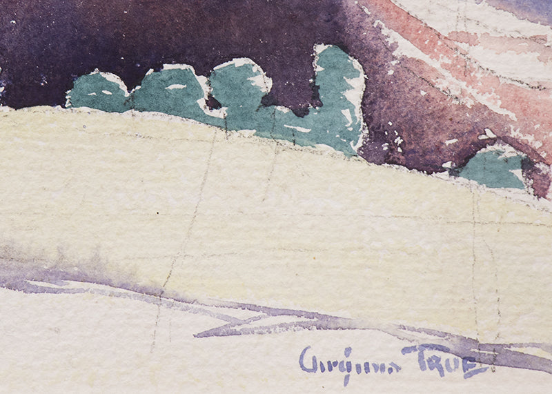 Original landscape painting by artist Virgina True (1900-1989). Southwest landscape featuring cacti, hills, and mountains. Watercolor on paper. Signed by the artist, lower right. Presented in a custom frame with an archival mat and AR Glass (UV Protection/Anti-reflective).