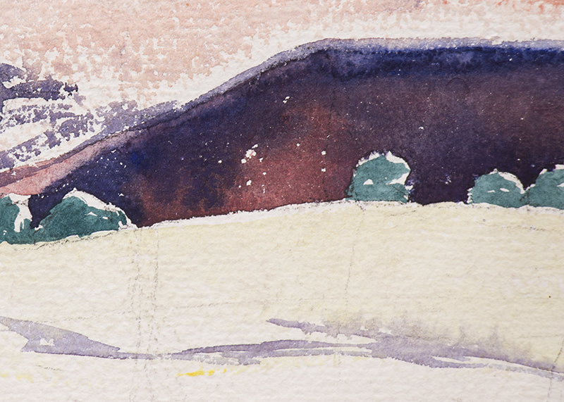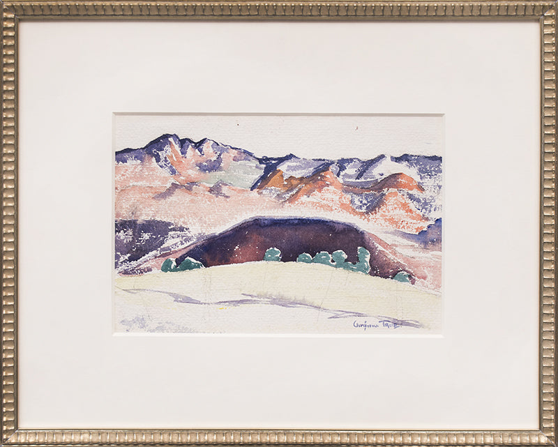 In the summer of 1928 True experienced both New Mexico communities and Southwest culture firsthand with Francis Hoar and her husband Clement Trucksess, her friends from the Herron Institute. They had relocated to Boulder in 1927 and were teaching at the University of Colorado. She recorded in her journal her initial reaction to the New Mexico landscape: "Might I preserve on canvas my thrill and deep feeling of the grand things of nature I have beheld today".There's a wideness in God's country that expresses peace to me." Inspired by her trip, True created a group of watercolors for her solo exhibition in 1928 at the Lieber Gallery in Indianapolis. They marked a transition from the realist style she learned at the Herron Institute to the more modernist, semi-abstract one she soon adopted.