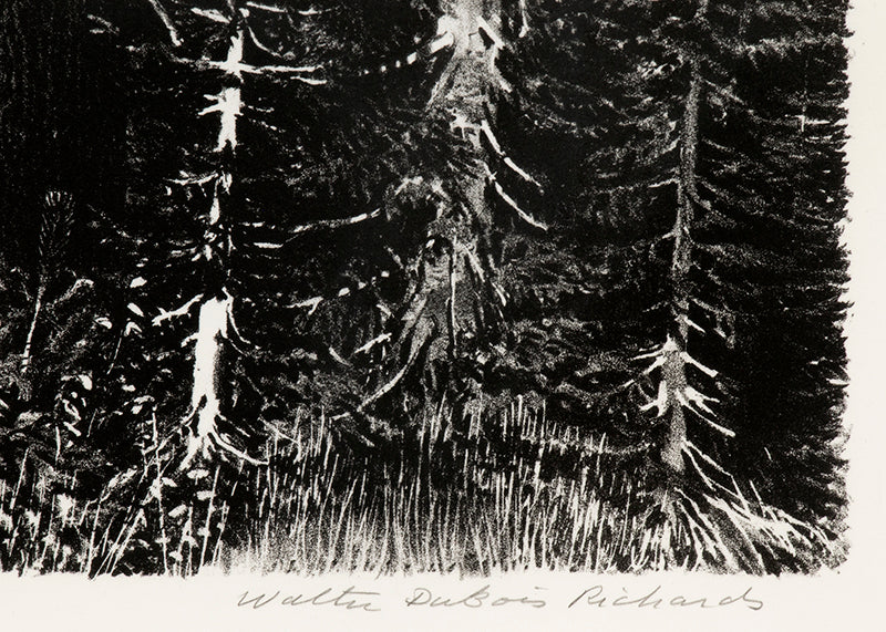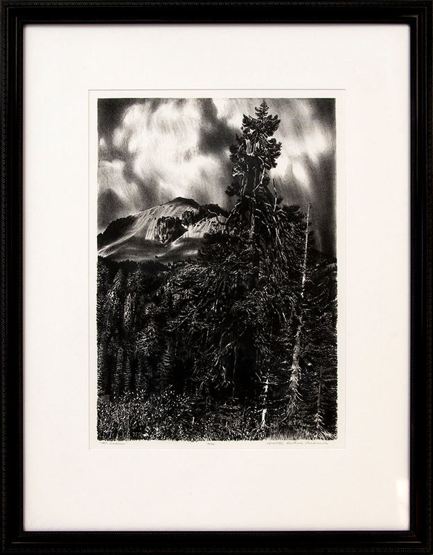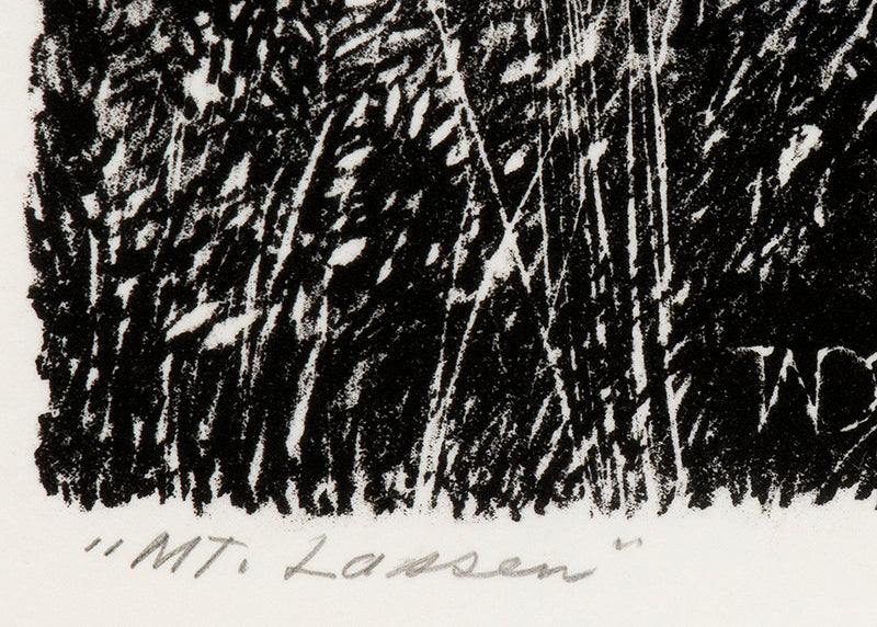 Mr Lassen, original vintage fine art print by artist Walter DuBois Richards. Composition depicts a view of Lassen Peak, located in Lassen Volcanic National Park in Northern California. Lithograph on paper. Signed by the artist, lower right; Numbered 19/20, lower center; Titled lower left. Presented in a custom frame.