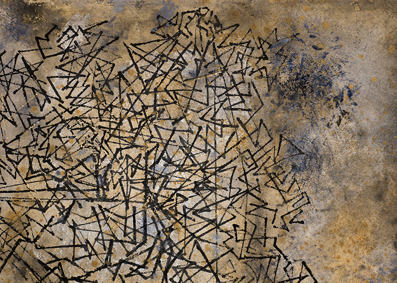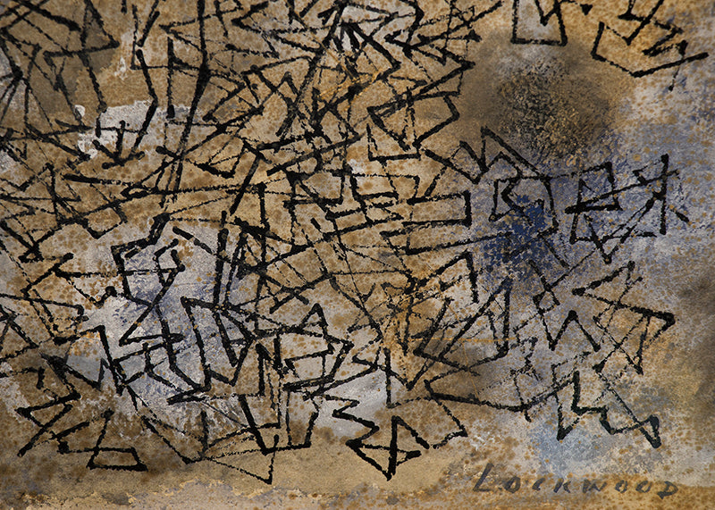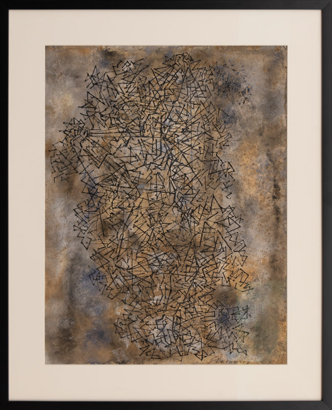 Web, original vintage circa 1950 abstract painting by artist Ward Lockwood. Composition featuring black triangular polygons on a mottled field of earth tones, including brown, gray, and ochre. Casein and India ink on paper. Signed by the artist, lower right; Titled on reverse. Presented in a new custom frame with archival 8-ply mat and UV 70 protectant glass.