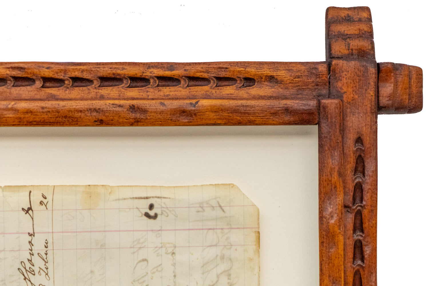 Original ledger art by Oklahoma artist James Black. The composition depicts a man on horseback wielding a bow and arrow. Colored pencil and ink on 19th century ledger paper. Signed by the artist and dated, 2025, lower center. Presented in a custom handcarved basswood frame by artisan Michael Blatnik with a 4 ply archival matt and UV70 protectant glass.