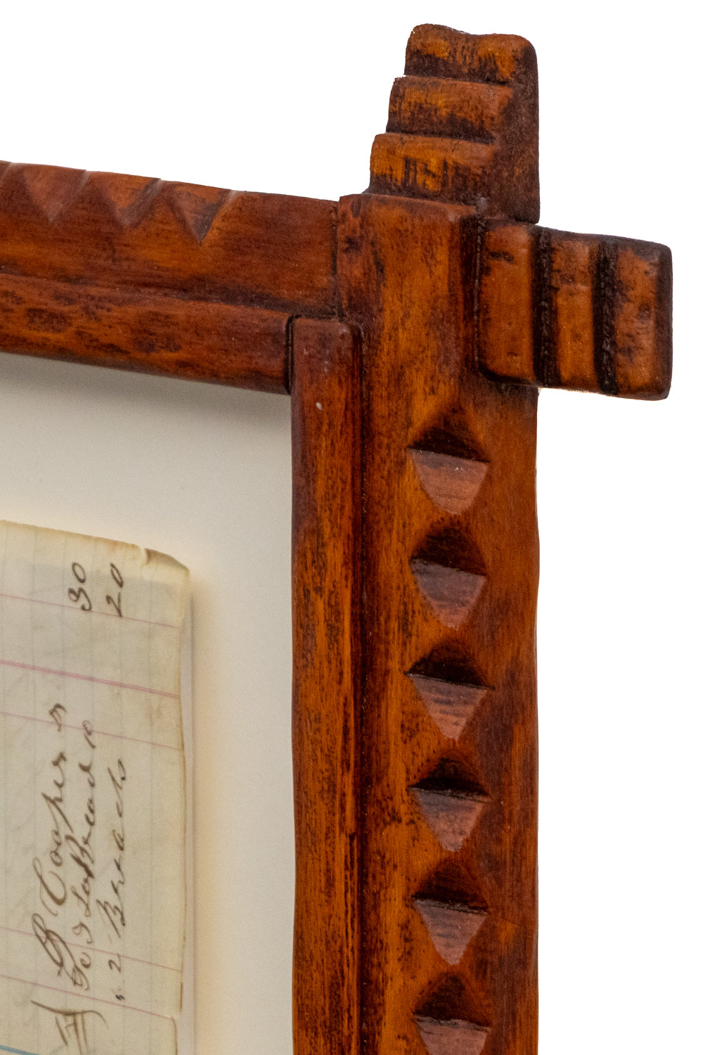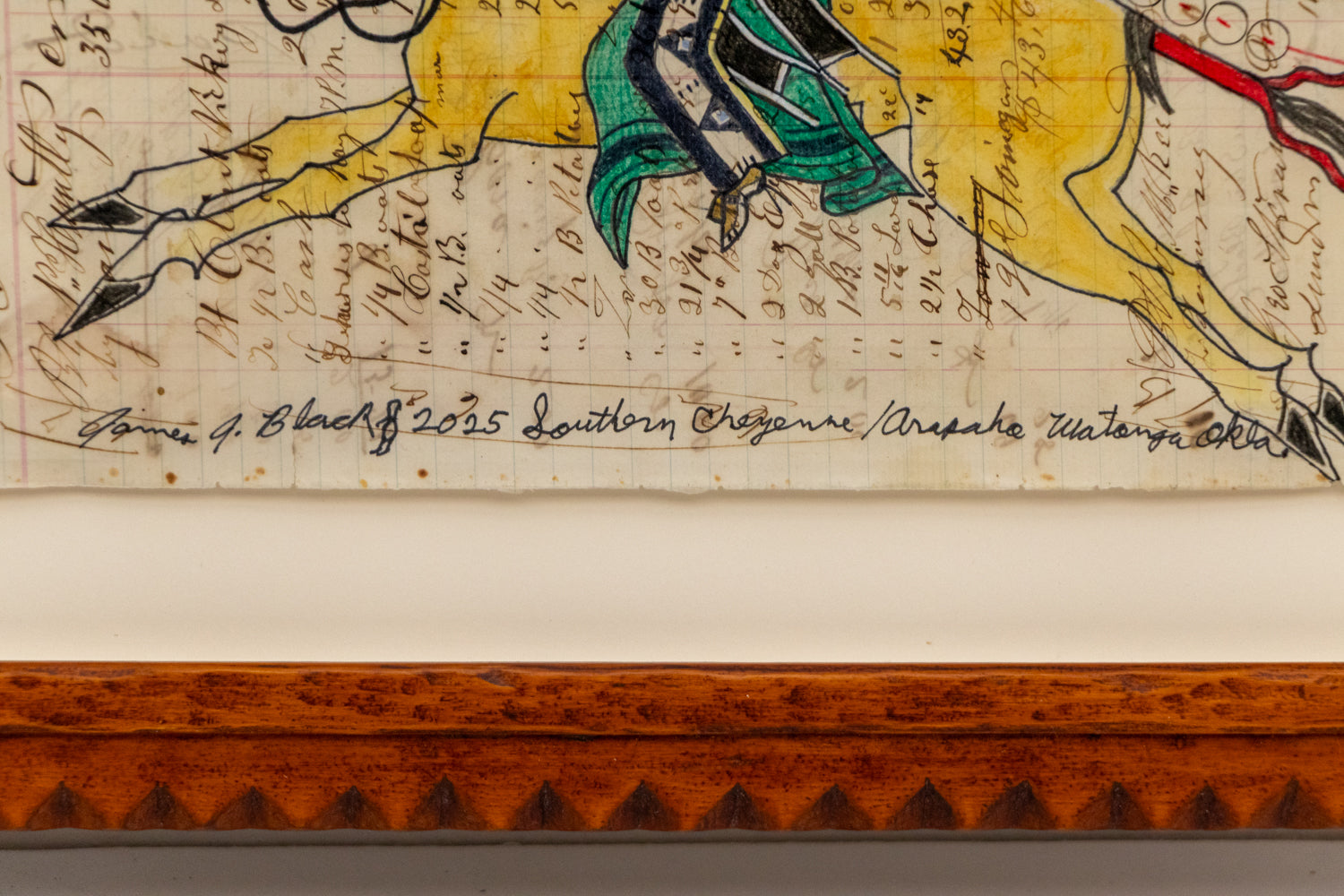 Original ledger art by Oklahoma artist James Black. The composition depicts a man on horseback wielding a rifle. Colored pencil and ink on mid 19th century ledger paper. Signed by the artist and dated, 2025, lower center. Presented in a custom handcarved basswood frame by artisan Michael Blatnik with a 4 ply archival mat and UV70 protectant glass.