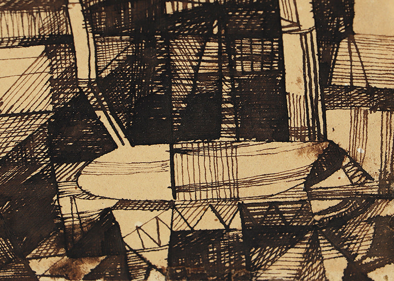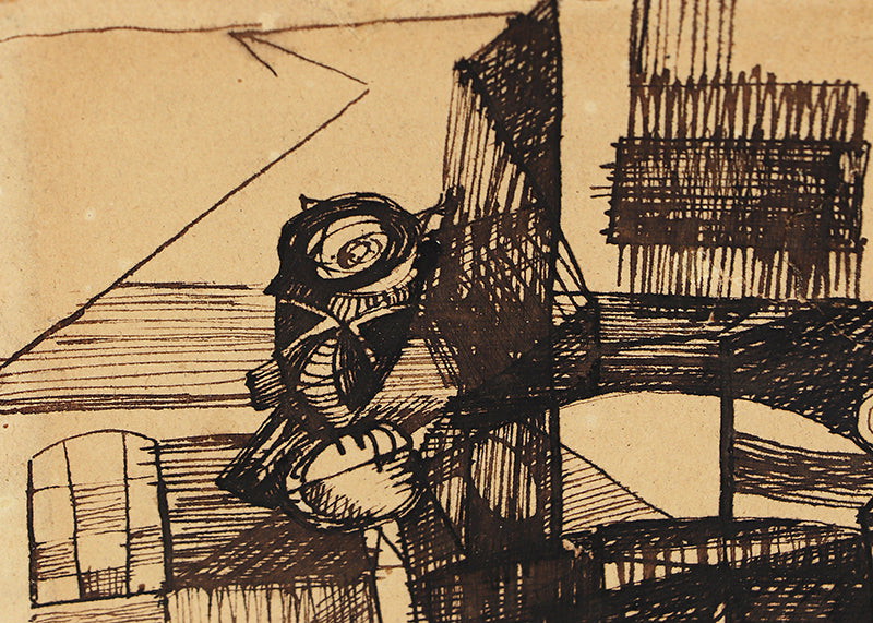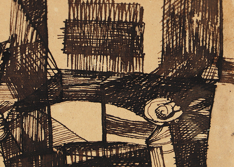 Original abstract drawing by artist William Bertrum Sharp. Minimalist composition with black ink on a beige field. Pen on paper. Signed by the artist on reverse. Presented in a custom frame.