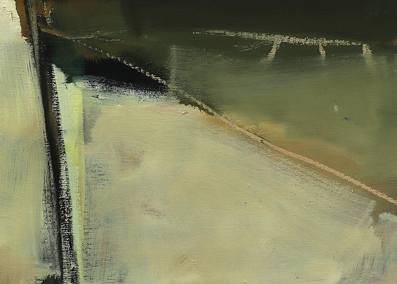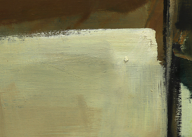 Original abstract painting by Denver artist Wilma Fiori. Composition in varying shades of brown, green, and beige. Oil on canvas. Signed by the artist and dated, 1994, on reverse. Custom wrapped canvas frame.