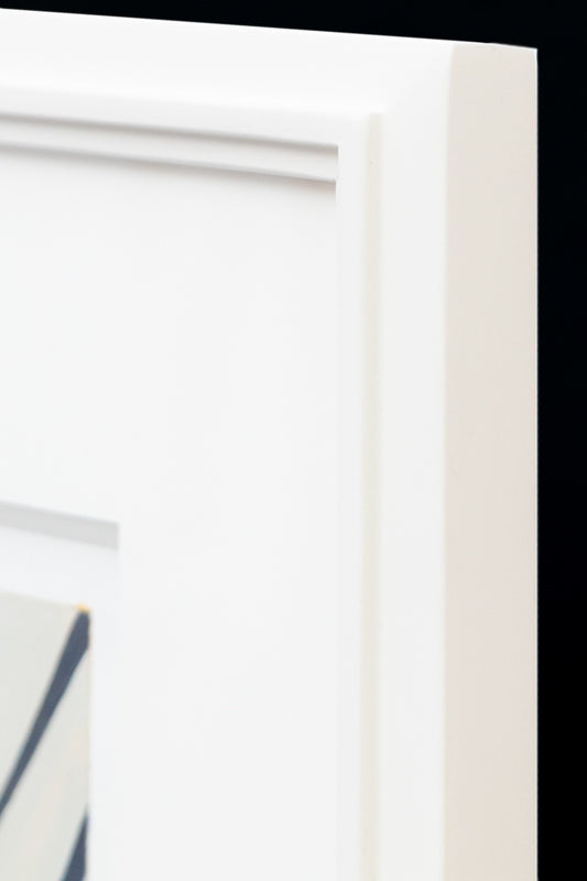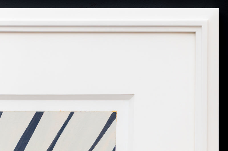 Yellow Series #5, original abstract composition by Denver artist Wilma Fiori. The lower two thirds of the composition feature yellow and pale pink strips, while the upper third contains white and black stripes reminiscent of a zebra. Oil on paper. Signed by the artist and dated, 2006, lower right; Signed, dated, and titled on reverse. Presented in a custom hand carved frame with 16 ply archival mat and UV70 protectant glass.