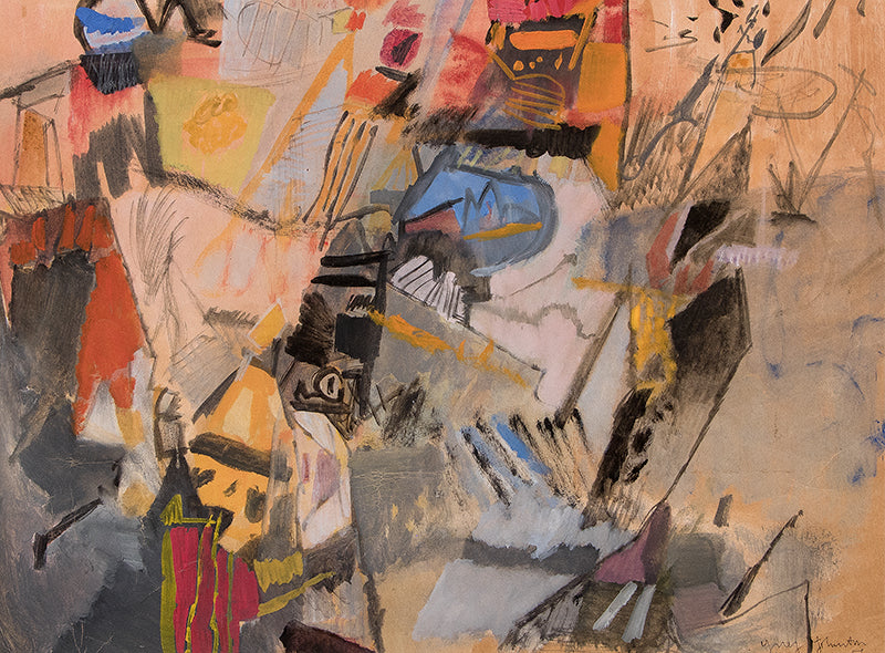 Original vintage painting by Colorado Springs artist Ynez Johnston. Abstract composition painted in grayscale with black and white pictographic elements. Watercolor and gouache on paper. Signed by the artist and dated, 1985, lower right. Presented in a custom white gold leaf frame with an archival 8 ply mat and UV70 protectant glass.