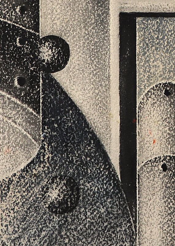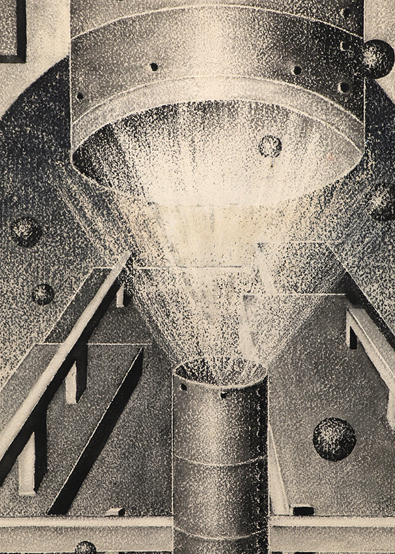 In the 1930s Bunnell used the oil, watercolor and lithography media to create a mini-genre of Colorado's old mining towns and mills, subject matter spurned by many local artists at the time in favor of grand mountain scenery. In contrast to his earlier images, these newer ones - both daytime and nocturnal -- such as Blue Bird Mine essentially are form studies. The conical, square and rectangular shapes of the buildings and other structures are placed in the stark, undulating terrain of the mountains and valleys devoid of any vegetation or human presence. In the mid-1930s he also used the same approach in his monochromatic lithographs titled Evolution, Late Evening, K.C. (Kansas City) and The Mill, continuing it into the next decade with his oil painting, Pikes Peak (1942).